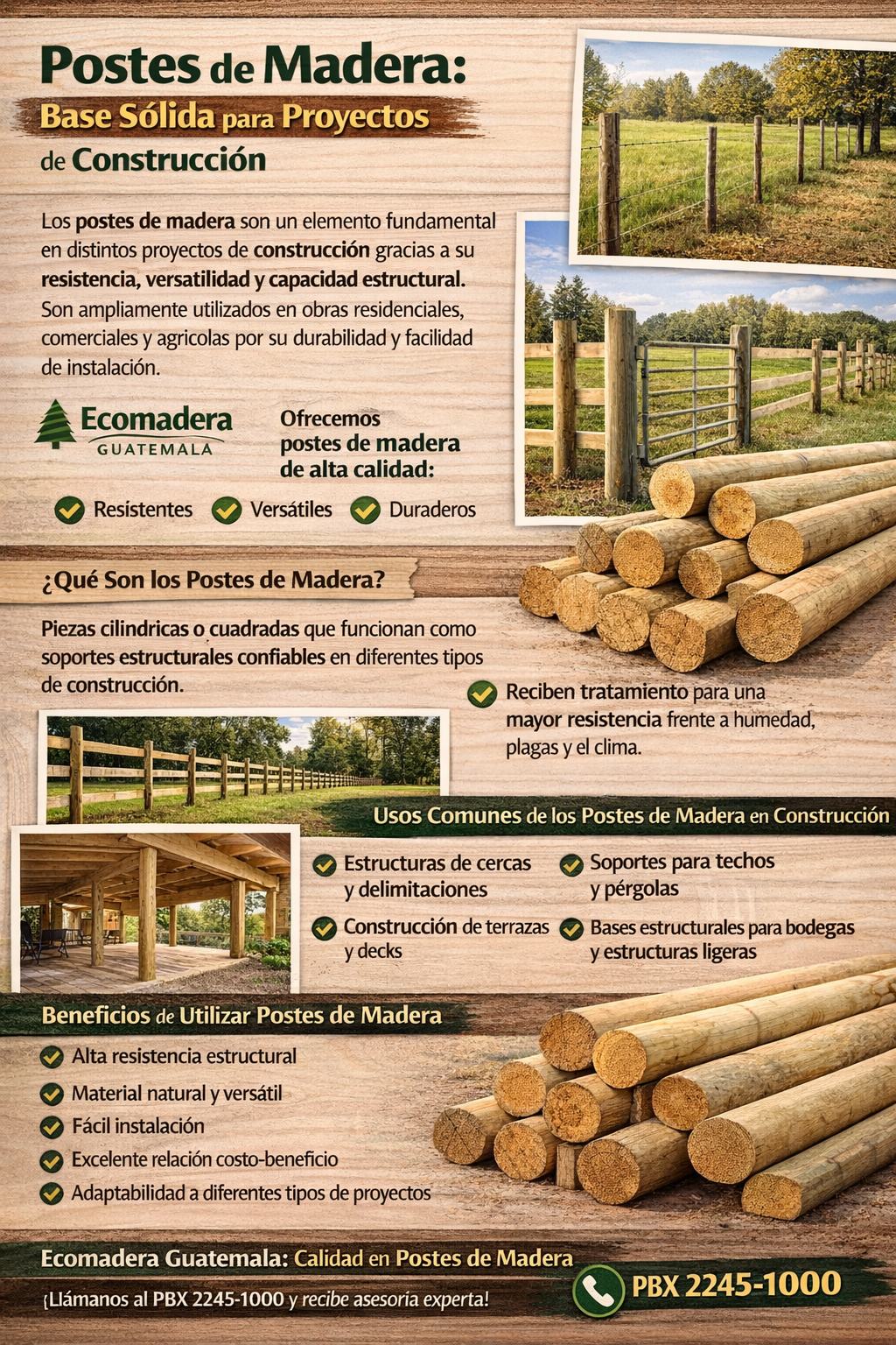 📞 Llámanos al PBX 2245-1000 y recibe asesoría sobre nuestros postes de madera para construcción.